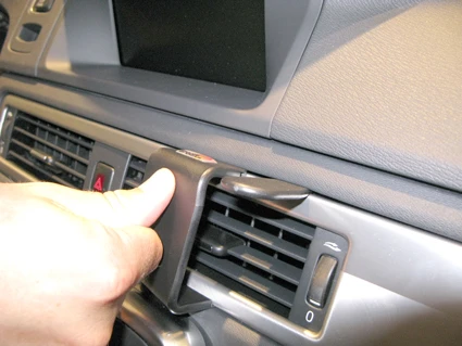 Press the gap opener into the gap between the frame surrounding the air vent and the dashboard. Press forwards on the upper part of the ProClip so the grooved edge goes into the gap next to the gap opener. Press alternately forward on the left and right side of the upper part of the ProClip. Press until you hear/feel it snaps into place. Pull out the gap opener.