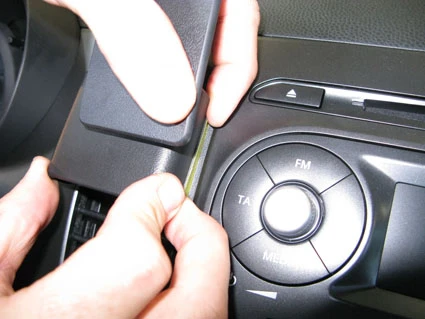 Press the ProClip leftward and hook the angled edge on the right part into the gap between the air vent and the panel surrounding the stereo.