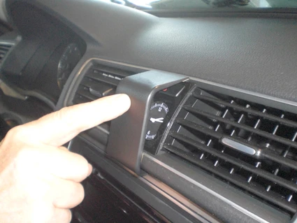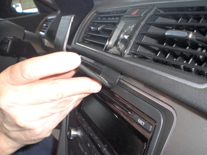 Use the enclosed alcohol pad to clean the area where the ProClip is to be installed. Press the thin ends of the thin gap opener into the gap between the air vent panel frame and the padded part of the dashboard, to widen the gap. Peel off the cover of adhesive tape on the ProClip. Hold the ProClip in an almost horizontal position and press the thin angled edge on the lower part into the gap/seam between the center console panel and the air vent panel overhang.
