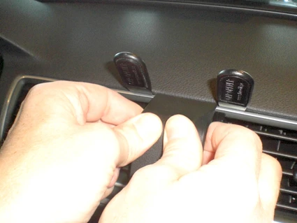 Flip the ProClip upwards, towards the air vent, so the angled edge on the lower part of the ProClip hooks behind the center console panel frame.