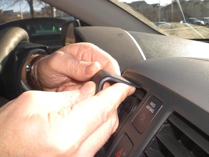 Use the enclsoed alcohol pad to clean the area where the ProClip is to be installed. Press the thin end of the enclosed gap opener into the gap between the air vent and the surrounding air vent frame, to widen the gap. Peel off the cover of adhesive tape on the ProClip.