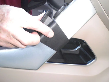 Use the enclosed alcohol pad to clean the area where the ProClip is to be installed. Press the thin end of the enclosed gap opener into the gap between the center console panel frame and the console edge, to widen the gap. Peel off the cover of adhesive tape on the ProClip.