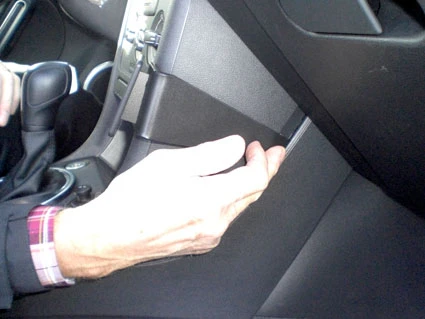 Press the gap opener into the gap in the console sidewall. Press forward on the right side of the ProClip face plate so the ProClip flexes forward and the angled edge hooks into the gap next to the gap opener. Pull out the gap opener.