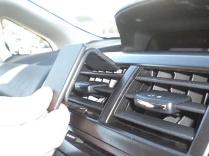 Press forward on the lower part of the ProClip so the angled edge hooks into the gap/seam between the air vent and the surrounding panel frame.