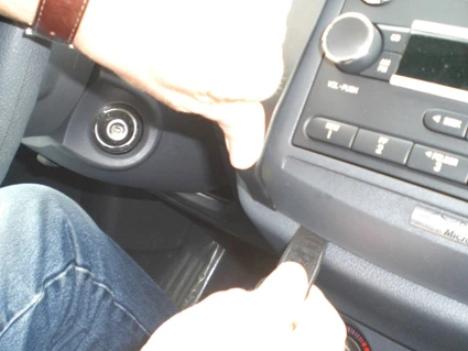 Use the enclosed alcohol pad to clean the area where the ProClip is to be installed. Press the thin end of the enclosed gap opener into the gap between the panel around the airvents and the panel around the radio and controls, to widen the gap. Peel off the cover of adhesive tape on the ProClip. Place the thin edge of the top of the ProClip into the widened gap.