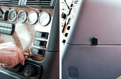 Peel off the cover of adhesive tape on both parts. Insert the curved edge of Part 1 into the gap next to the gap opener. Flip/rotate Part 1 upward so the curved edge goes into the gap. Before adhering it to the dash please make sure the holes will line up with Part 2.