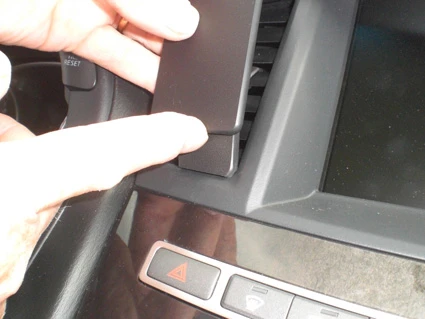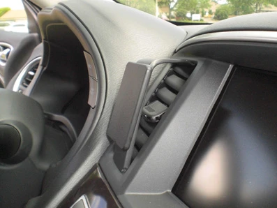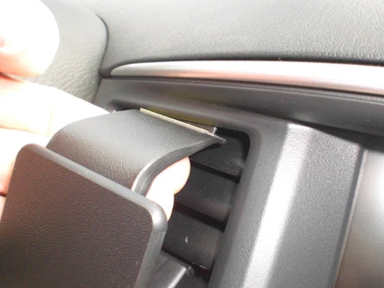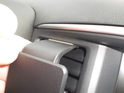Place your index finger onto the bottom of the ProClip and push so it flexes upward. Push the ProClip a tiny bit forward and let go of the pressure so the thin end goes into the gap between the air vent and the surrounding panel frame.