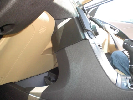 Push firmly forward on the left side of the ProClip so it flexes forward and the angled edge hooks around the console edge. Pull out the gap opener.