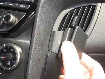 Use the enclosed alcohol pad to clean the area where the ProClip is to be installed. Peel off the cover of adhesive tape on the ProClip. Place the right side of the ProClip in front of the air vent and then press the thin angled edge into the seam/gap between the air vent and the console side wall.