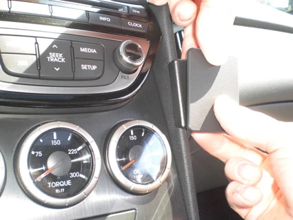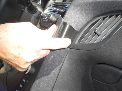 Flip the ProClip to the left, towards the center console, so the angled edge on the right side of the ProClip hooks behind the air vent edge. Place your index fingers behind the ProClip. Pull towards you and hook the angled edge on the left side of the ProClip around the console edge.