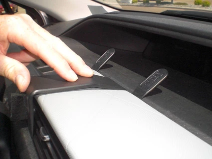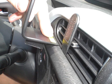 On each side of the ProClip, press the gap openers into the gap between the air vent panel frame and the dashboard. Start with the gap opener to the left of the ProClip. Push on the upper part of the ProClip so it flexes forward and hooks around the panel edge between the gap openers. Pull out the gap openers.