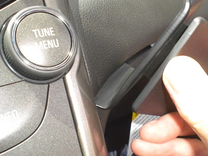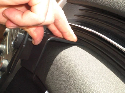 Press down on top of the ProClip with your fingers and forward on the upper part off the ProClip with your thumb so the grooved edge goes into the gap between the padded dashboard ledge and the panel frame. Press until you see or hear/feel it click into place.