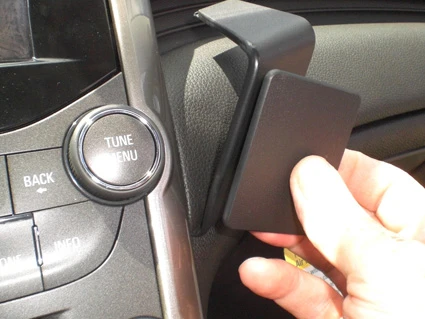 Use the enclosed alcohol pad to clean the area where the ProClip is to be installed. Peel off the cover of adhesive tape on the ProClip. Place the angled edge of the ProClip into the gap between the the two padded parts of the dashboard.