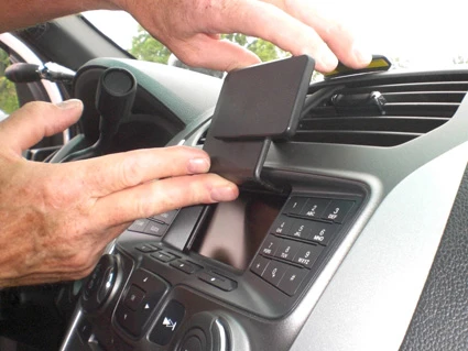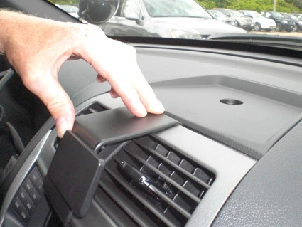 Push firmly on the upper part of the ProClip so it flexes forward and hooks around the air vent panel fame edge. Press firmly down on top of the ProClip to make sure the angled edge is properly in place.