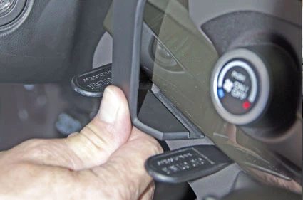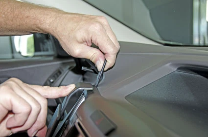 Press the thin end of the enclosed gap openers into the gap between the two panels shown in the photo, to widen the gap. Use the enclosed alcohol pad to clean the area where the ProClip is to be installed. Peel off the cover of adhesive tape on the ProClip. Press the grooved edge on the lower part of the ProClip mount into the gap between the gap openers. It will help to insert the left side first and then press the right side in. Pull out the gap openers.