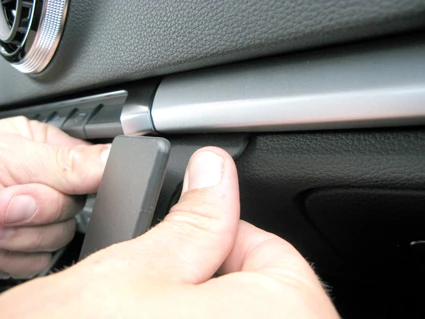 Flip the ProClip downward/forward so the curved upper edge hooks behind the trim. Adjust the ProClip position sideways so the grooved left edge is placed in front of the gap between the climate control panel and the surrounding frame.