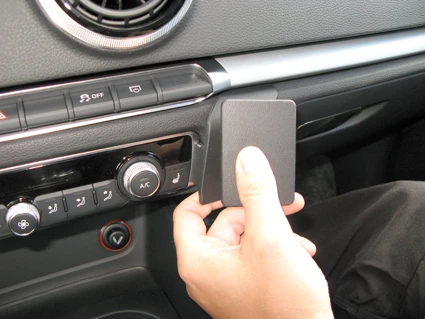 Press the grooved edge on the left part of the ProClip into the gap beween the climate control panel and the surrounding frame. Press until you hear/feel it snaps into place.