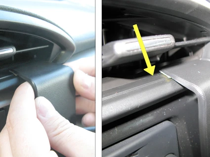 Pull the upper part of the ProClip upward and hook the angled edge into the gap between the air vent and the surrounding frame inside the lower part of the arivent.