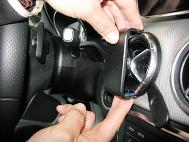 Use the enclosed alcohol pad to clean the area where the ProClip is to be installed. Peel off the adhesive tape covers on the ProClip. Preee the thin end of the enlcosed gap opener into the gap between the frame surrounding the air vent and the dashboard, to widen the gap Press the angled edge on the lower part of the ProClip into the gap next to the gap opener. Press uppward on the lower part of the ProClip so the angled edge goes all the way into the gap. Pull out the gap opener.