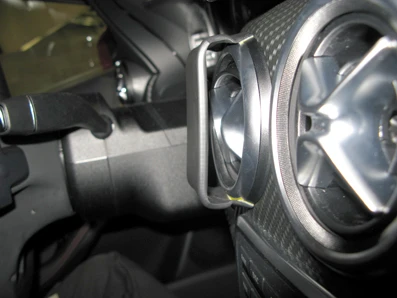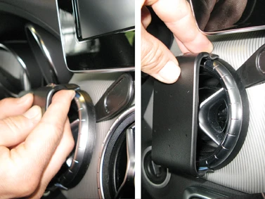 Press the gap opener into the gap between the frame surrounding the air vent and the dashboard. Pull the upper part of the ProClip upward and hook the angled edge into the gap next to the gap opener. Press downward on top of the ProClip so the angled edge goes all the way into the gap. Pull out the gap opener.