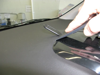 Press the thin end of the enclosed gap opener into the gap between the center console and the dashboard, to widen the gap. Use the enclosed alcohol pad to clean the area where the ProClip is to be installed. Remove the adhesive tape cover on the ProClip. Press/hook the upper edge of the ProClip into the gap next to the gap opener.