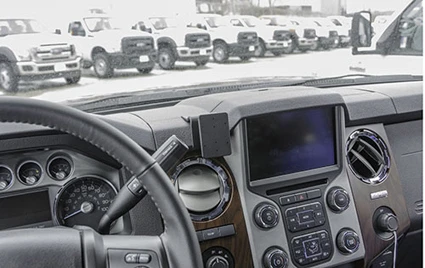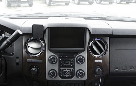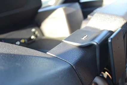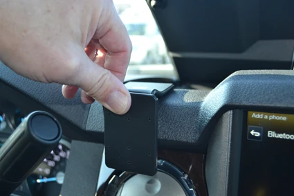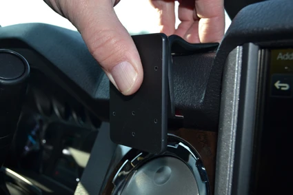 Press forward on the upper part of the ProClip until the J-shaped angled edge on the top hooks over the dash edge where the dash top door is open.