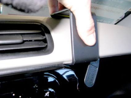 Press the thin end of the enclosed gap opener into the gap between the dashboard and control panel, to widen the gap. Use the enclosed alcohol pad to clean the area where the ProClip is to be installed. Peel off the adhesive tape covers on the ProClip. Carefully press the angled lower part of the ProClip into the gap next to the gap opener.