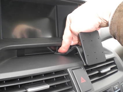 Use the enclosed alcohol pad to clean the area where the ProClip is to be installed. Peel off the adhesive tape cover on the ProClip. Hook the angled edge on the front part of the ProClip into the top of the right air vent opening.