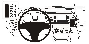 Use the enclosed alcohol pad to clean the area where the ProClip is to be installed. Press the thin end of the enclosed gap opener into the gap dividing the central control panel and the lower edge of the dashboard, to widen the gap. Remove the adhesive tape covers on the ProClip. Press the lower angled edge of the ProClip into the gap next to the gap opener.
