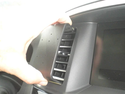 Using your thumb and fingers, flex the ProClip together and insert the upper angled edge of the ProClip into the seam between the upper inside of the vent and the frame around the vent.
