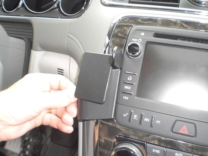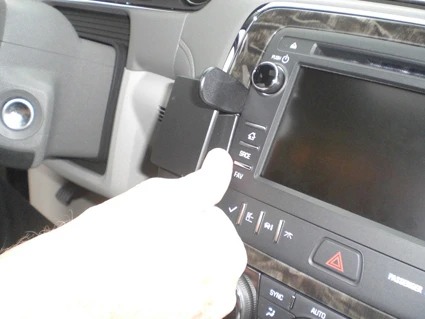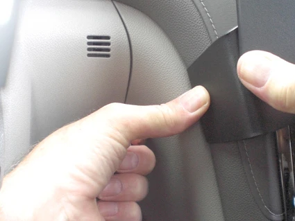 Press the thin end of the enclosed gap opener into the gap between the stereo and the center console panel frame, to widen the gap. Push on the left side of the ProClip so it fleces toward the stereo and the angled edge hooks into the gap below the gap opener.