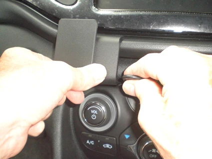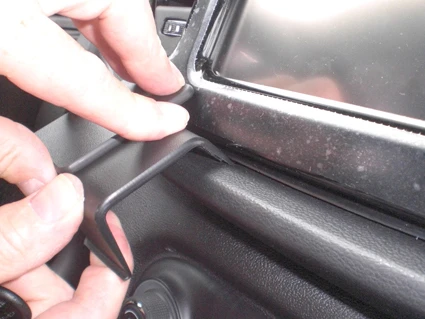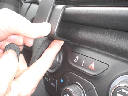 Use the enclosed alcohol pad to clean the area where the ProClip is to be installed. Peel off the adhesive tape cover on the ProClip. Press the angled edge on the upper part of the ProClip into the seam between the dashboard ledge and the thin panel below the navigation screen panel. Then flip the ProClip downward so the lower angled edge on the ProClip hooks behind the panel.