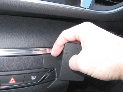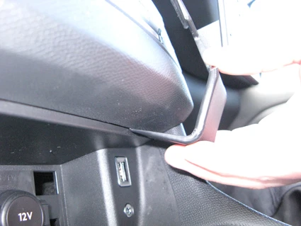 Press the angled upper part of the ProClip into the gap between the décor trim and the center console. Press until you hear/feel the edge goes all the way in.