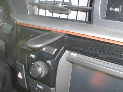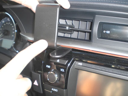 Press the thin end of the gap opener into the gap between the air vent ledge panel frame and padded part of the upper dashboard. Press/lift the ProClip forward so the upper angled edge goes into the gap next to the gap opener. Pull out the gap opener.