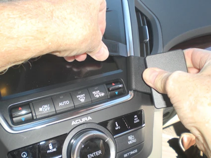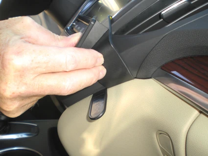 Press the thin end of the enclosed gap opener into the gap between the center panel and the padded part of the dashboard, to widen the gap. Then press firmly forward on the right side of the ProClip so it flexes forward and hooks around the panel edge next to the gap opener. Pull out the gap opener.