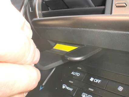 Use the enclosed alcohol pad to clean the area where the ProClip is to be installed. Peel off the adhesive tape cover on the ProClip. Press the thin end of the enclosed gap opener into the gap between the center console instrument panel and the frame surrounding the panel, to widen the gap. Then press/hook the angled edge on the lower part of the ProClip into the gap next to the gap opener. Pull out the gap opener.