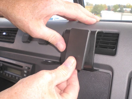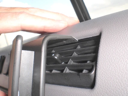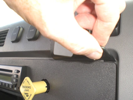 Use the enclosed alcohol pad to clean the area where the ProClip is to be installed. Peel off the adhesive tape cover on the ProClip. Press the angled edge on the upper part oc the ProClip up into the gap between the dash and the air vent house.