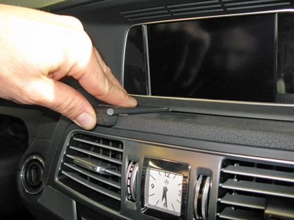 Use the enclosed alcohol pad to clean the area where the ProClip is to be installed. Peel off the adhesive tape cover on Part 1. Place Part 1 so the adhesive tape is pointing downward, and press the grooved edge into the gap between the frame surrounding the display and the panel in front of the display. Press until you hear/feel it snaps into place.