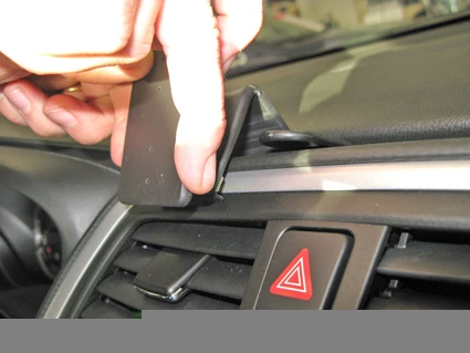 Press the thin end of the enclosed gap opener into the gap between the frame surrounding the center console and the dashboard, to widen the gap. Use the enclosed alcohol pad to clean the area where the ProClip is to be installed. Remove the adhesive tape cover on the ProClip. Press/hook the angled upper edge of the ProClip into the gap next to the gap opener.