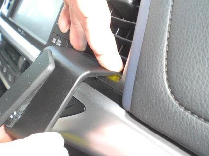 Use the enclosed alcohol pad the clean the area where the ProClip is to be installed. Peel off the cover of adhesive tape on the ProClip. Place the upper part of the ProClip onto the lower air vent ledge.