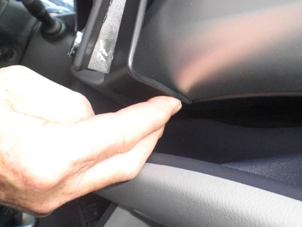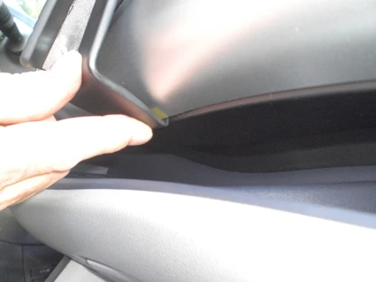 Push forward on the lower part of the ProClip with your thumb so the angled edge goes into the seam/gap between the panel sections underneath the dashboard overhang.