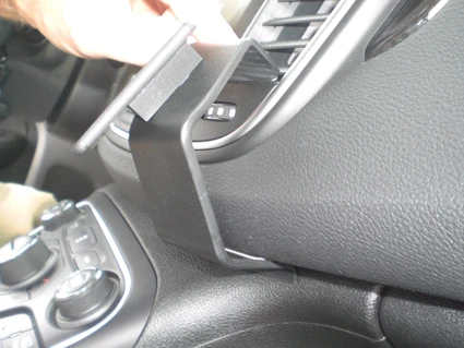 Flip the ProClip upward so the angled edge on the lower part hooks behind the padded dashboard section. Then place you index finger underneath the upper part of the ProClip. Pull upward and hook the angled edge over the air vent edge. Note: to make the angled edge go all the way into the seem between the air vent and the surrounding panel frame pull towards you and press down at the same time