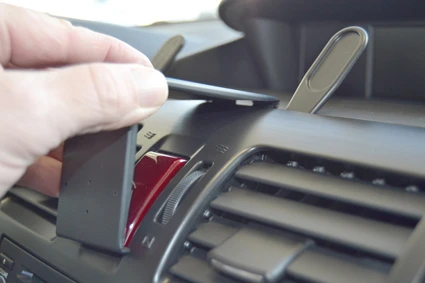 Insert one gap opener into the seam between the frame around the vents and the radio. (Models with a navigation/information screen will not need to insert a gap opener.) Place your fingers behind the faceplate and flex the lower angled edge of the ProClip into the seam next to the gap opener. Pull out the gap opener.