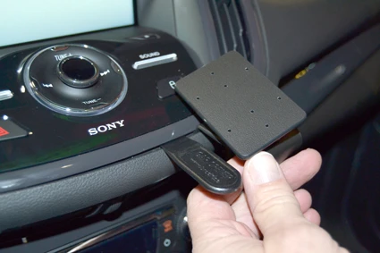 Use the enclosed alcohol pad to clean the area where the ProClip is to be installed. Peel off the cover of adhesive tape on the ProClip. Press the thin end of the enclosed gap opener into the gap between the climate control panel and the dashboard, to widen the gap.