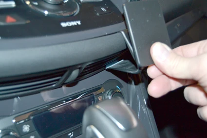 Press the curved edge on the upper part of the ProClip into the gap next to the gap opener. Flip the ProClip downward so the curved upper edge on the upper part of the ProClip hooks behind the climate control panel. Pull out the gap opener.