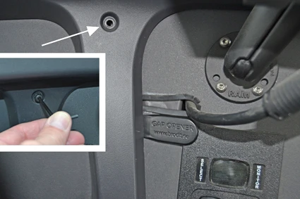 Use the enclosed alcohol pad to clean the area where the ProClip will be installed. Remove the screw in the dashboard as shown in the photo. Press the thin end of the enclosed gap opener into the gap between the center instrument panel and the panel frame, to widen the gap. Peel off the adhesive tape cover on the ProClip.
