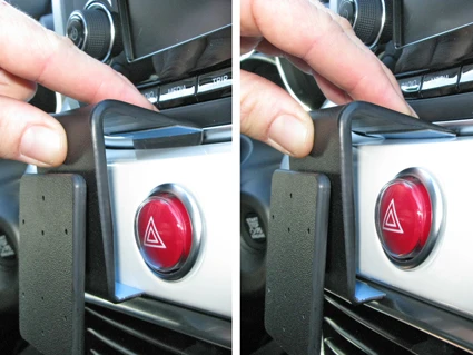Use the enclosed alcohol pad to clean the area where the ProClip is to be installed. Remove the adhesive tape covers on the ProClip. Press the angled upper edge of the ProClip into the gap between the paneling and the remainder of the center console.