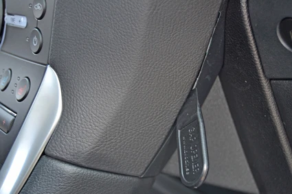 Pull the front part of the ProClip slightly toward you so the angled left edge hooks into the gap between the padded part of the console side wall and the climate control panel. The ProClip is in place.