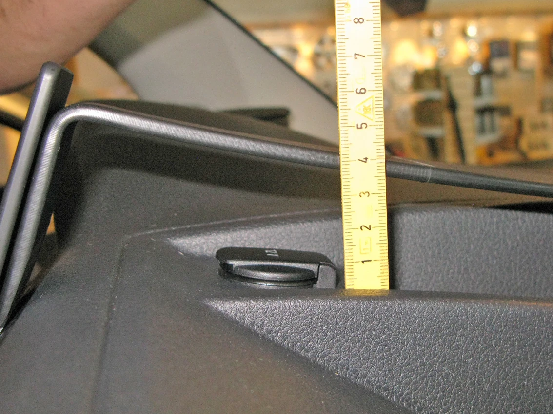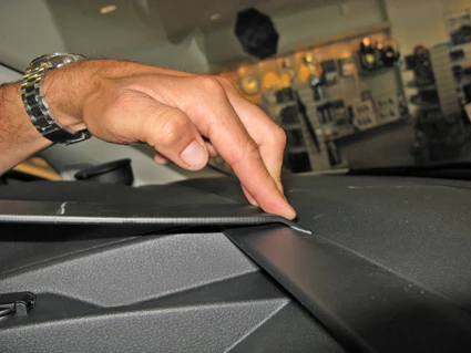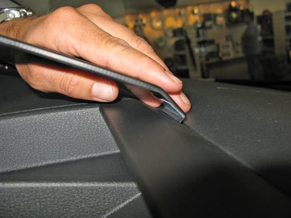 Use the enclosed alcohol pad to clean the area where the ProClip is to be installed. Remove the adhesive tape covers on the ProClip. Insert the angled upper edge of the ProClip into the gap dividing the top part of the dashboard.