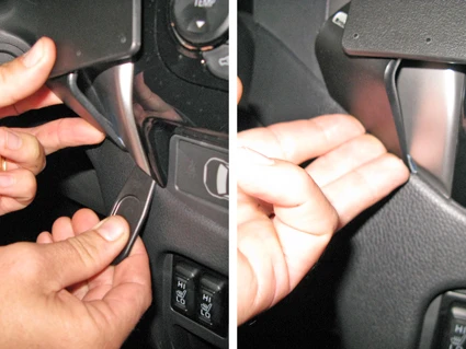 Use the enclosed alcohol pad to clean the area where the ProClip is to be installed. Press the thin end of the enclosed gap opener into the gap dividing the center control panel, to widen the gap. Remove the adhesive tape cover on the ProClip.
